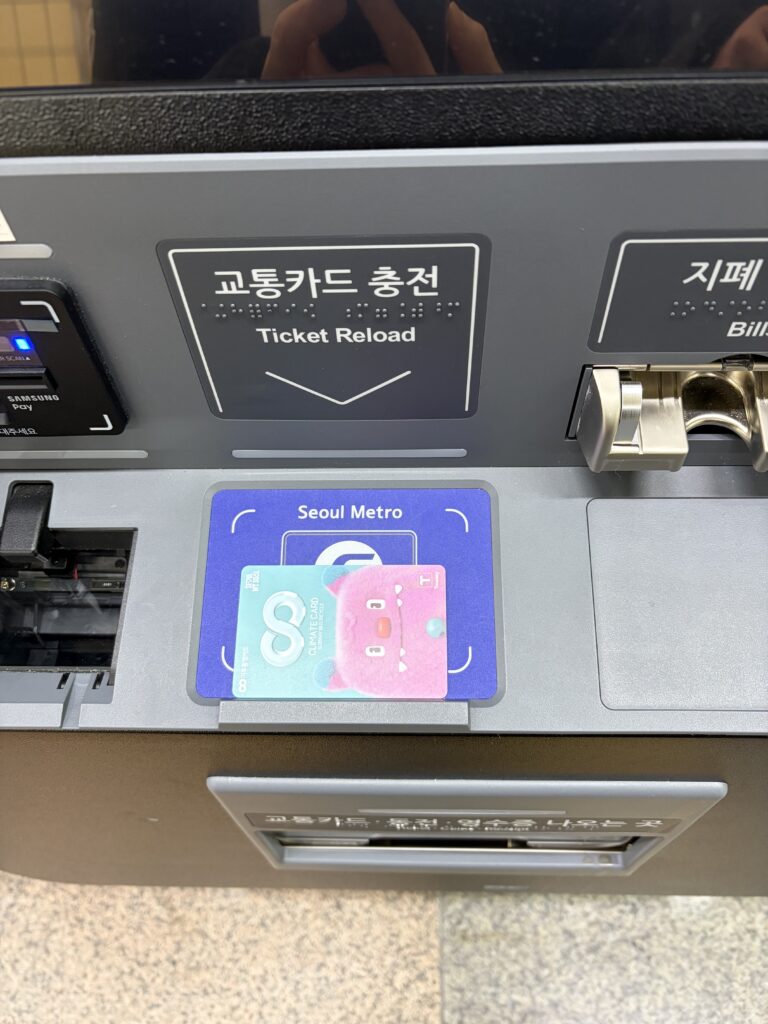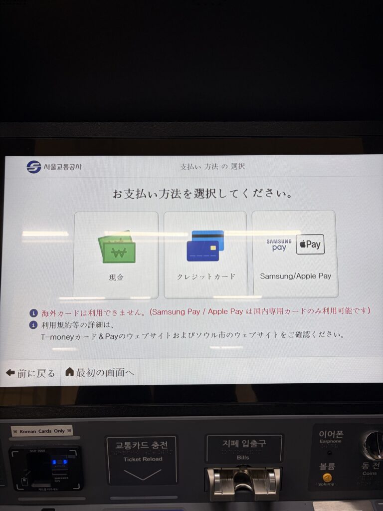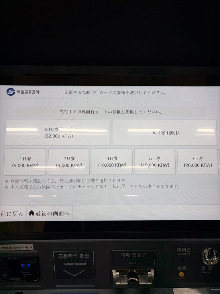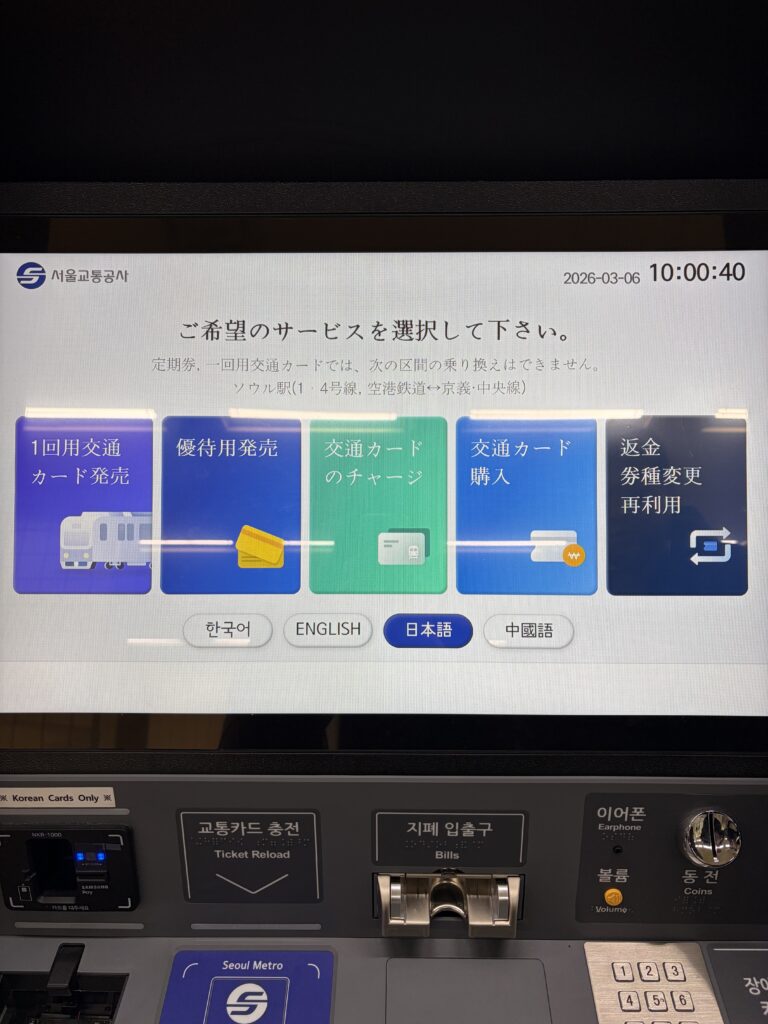 更に、新型の券売機ではチャージだけではなく交通カードの購入も可能で、まだ現金(KRW)を持っていない観光客にとってスピーディーかつ簡単に購入できるようなシステムは有り難いですよね。